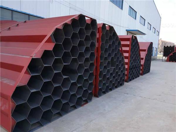 ?。?)蜂窩式電捕焦油器。蜂窩式與管式的結(jié)構(gòu)相同,是將通道截面由圓形改為正六邊形。兩個(gè)相鄰正六邊形共用一條邊,即靠中間的正六邊形的六條邊均被包圍它的六個(gè)正六邊形所共用。用2~3mm的鋼板制成的蜂窩板即可滿足工藝和機(jī)械強(qiáng)度的要求。由于蜂窩式電捕焦油器具有結(jié)構(gòu)緊湊合理、沒有電場空穴、有效空間利用率高、重量輕、耗鋼材少和捕集特性好等優(yōu)點(diǎn),但存在制造難度大,在運(yùn)輸安裝過程中易產(chǎn)生誤差等缺點(diǎn)。隨著設(shè)備制造工藝水平的提高,蜂窩式電捕焦油器的優(yōu)點(diǎn)會(huì)越來越受到人們的重視,必將逐步取代同心圓式和管式電捕焦油器。鈺泰環(huán)保生產(chǎn)蜂窩式電捕焦油器
