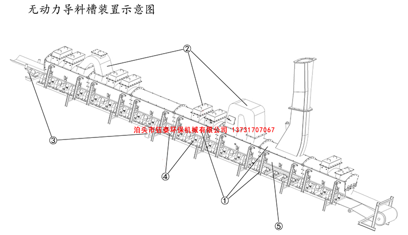 我公司的無動力導(dǎo)料槽運(yùn)行中使粉塵在多級循環(huán)后衰減,掉落在皮帶上,無需任何電源設(shè)備,是O物料輸送轉(zhuǎn)運(yùn)O理想的除塵環(huán)保設(shè)備。